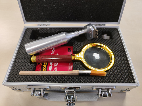 Нож-адгезиметр широко используется для оценки адгезии различных покрытий. В ручку-держатель устанавливаются высокоточные многолезвийные резаки с режущими лезвиями с различным расстоянием между ними. Тест адгезии проводится путем выполнения 2 серий поперечных надрезов под прямым углом. Полученные надрезы либо чистят кисточкой (щеткой), либо очищают адгезионной лентой (скотчем). В зависимости от толщины покрытия и соответствующего расстояния результаты могут быть классифицированы по стандартной шкале.